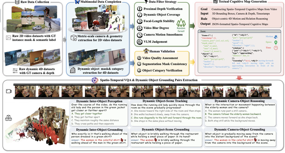 人类每天都生活在一个动态演变的4D世界中——物体在移动、场景在变化、时间在流逝。人类可以轻松地判断两辆车是在靠近还是远离,可以预测一个行人何时会走出画面,也能理解摄像机的移动如何影响我们对深度的感知。这种"在动态中思考"的能力,对人类而言如此自然,然而把同样的问题抛给当前最强大的多模态大模型时,答案却令人意外。这些在静态图像理解上已经接近人类水平的模型,在面对时空动态推理时却显得力不从心。它们可以准确描述一帧画面中的物体,却难以追踪这个物体在连续帧中的运动轨迹;它们能够识别空间关系,却无法推理这种关系如何随时间演变。现有的基准几乎都停留在场景级别的粗粒度评测,缺乏对动态物体的细粒度追踪与定位能力的考察。为此,本文提出一个根本性的问题:多模态大模型究竟能否像人类一样,在动态中感知、在变化中追踪、在演变中推理?为了回答这个问题,本文构建了Dyn-Bench——一个专注于动态理解的大规模基准,旨在全面探索MLLM的时空推理边界。