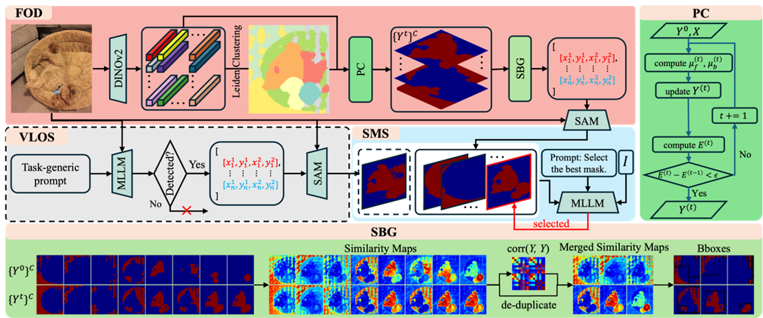 现有的零样本伪装物体分割方法通常采用“先发现后分割”的两阶段流水线:即先利用多模态大语言模型(MLLMs)获取视觉提示,随后进行 SAM(Segment Anything Model)分割。然而,仅依赖 MLLMs 进行伪装物体发现往往会导致定位不准、误报和漏检等问题。为解决这些问题,本文提出了 Discover-Segment-Select (DSS,发现-分割-选择) 机制,这是一种旨在逐步细化分割结果的渐进式框架。该方法包含以下三个核心模块:特征一致性物体发现(FOD)模块:利用视觉特征生成多样化的物体候选提案(proposals);分割模块:通过 SAM 分割对这些提案进行细化;语义驱动掩码选择(SMS)模块:利用 MLLMs 从多个候选掩码中评估并筛选出最佳结果。在无需任何训练或监督的情况下,DSS 在多个 COS 基准测试中均达到了当前最先进的水平,尤其是在多实例场景中表现出色。