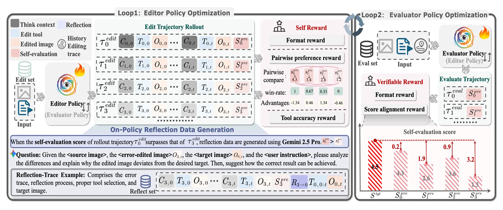 现有的 Image Editing Agent,真的“懂”修图吗?是在迈向通用人工智能的道路上,一直在思考一个问题。大多数基于 LLM/VLM 的智能体,本质上更像是一个“盲目的指挥官”。它们能流利地写出修图代码或调用 API,但在按下回车键之前,它们看不见画布上的变化,也无法像人类设计师那样,盯着屏幕皱眉说:“这张对比度拉太高了,得往回收到一点。”这种感知与决策的割裂,直接导致了‘指令幻觉’,或者说模型在进行盲目的‘脑补’。由于缺乏视觉反馈,模型往往凭空想象下一步操作,导致结果与用户的初衷南辕北辙。此外,在传统强化学习中经常依赖于静态的奖励模型。随着模型的不断训练,它很容易学会如何“讨好”这个固定的打分器,导致 Reward Hacking——即分数很高,但审美并没有真正提升。 为了打破这一僵局,JarvisEvo 应运而生。它不仅仅是一个连接 Adobe Lightroom 的自动化工具使用者,更是一次大胆的探索:探索 Agent 如何通过“内省”,真正实现自我进化。
