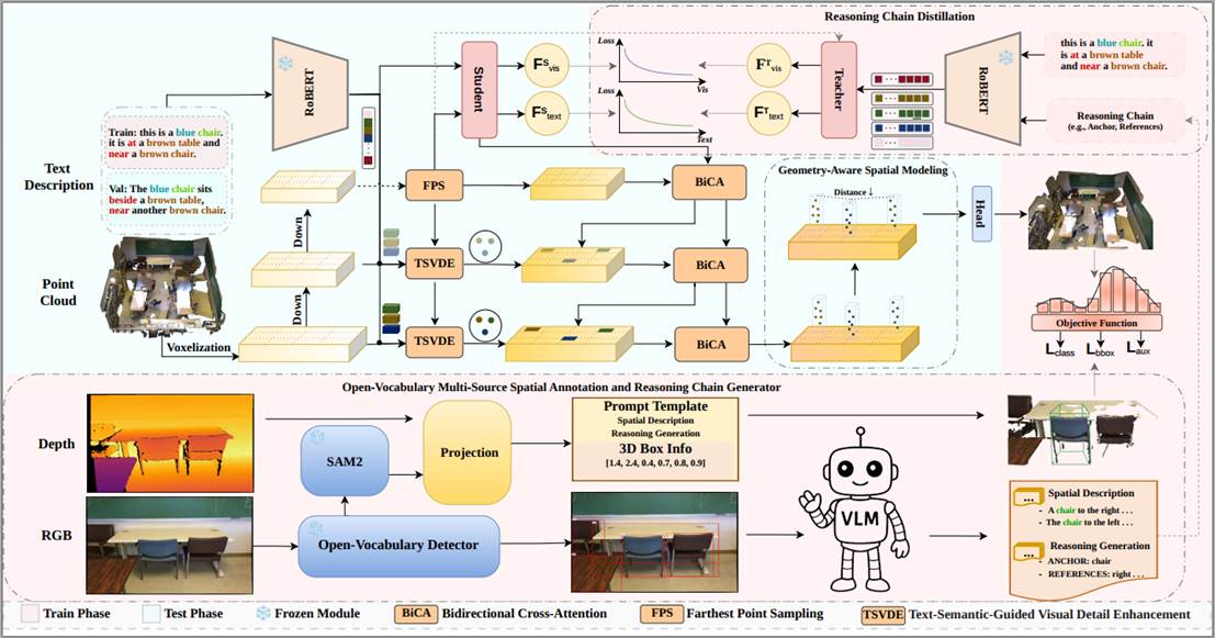 零样本三维视觉定位(Zero-Shot 3DVG)旨在不依赖人工实例级描述标注的条件下,根据自然语言描述在三维场景中定位目标物体。针对现有方法在推理阶段依赖额外2D图像输入,或需要与LLM/VLM进行多轮交互而导致推理延迟高、计算开销大、部署复杂度高的问题,本研究提出了基于生成语言条件的无辅助零样本三维视觉定位方法(UZ3DVG):在推理阶段仅使用三维点云和文本描述,不依赖外部模型。在训练阶段,本团队设计了开放词汇多源空间标注与推理链生成器,从开放场景中的RGB-D图像或3D投影的2D图像生成空间伪标签与推理链,以训练一个具备稳健空间推理能力的轻量级3DVG模型。对此,本研究通过推理链蒸馏模块(RCD),将较大的教师网络提取的推理知识迁移到轻量级学生网络,并引入几何感知空间建模(GeoSM)模块联合建模全局与局部几何关系,辅助文本推理与3D空间结构对齐,进一步提升模型空间推理及定位能力。实验结果表明,UZ3DVG在ScanRefer和NR3D上取得零样本SOTA性能,推理速度达7.69 FPS,约为现有SOTA方法的38倍,建立了开放场景下零样本3DVG的新范式。