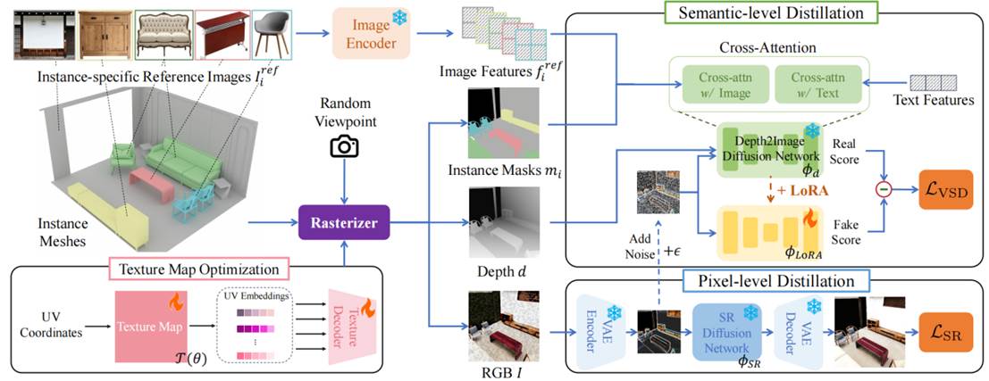 创建高保真、可定制的3D室内场景纹理仍然是计算机图形学与数字化室内设计领域的一项重大挑战。虽然文本驱动的方法具有灵活性,但缺乏对细粒度实例级控制的精确性,且生成的纹理往往质量不足,存在瑕疵和预渲染阴影。为此,我们推出了CustomTex,这是一个由参考图像驱动的、用于实例级高保真场景纹理生成的新颖框架。CustomTex接收未添加纹理的3D场景以及一组为每个对象实例指定所需外观的参考图像,并生成统一的高分辨率纹理贴图。我们方法的核心是一种双蒸馏方法,可以将语义控制与像素级增强分离。我们采用配备了实例交叉注意力的语义级蒸馏技术,以确保语义合理性以及“参考-实例”对齐,并采用像素级蒸馏技术来确保高视觉保真度。语义控制和像素级增强两种机制被整合到同一个基于变分分数蒸馏的优化过程中。实验表明,CustomTex能够与参考图像实现精确的实例级一致性,并生成具有更高清晰度、更少瑕疵和最少预渲染阴影的纹理。本文工作为高质量、可定制的3D场景外观编辑开辟了一条更直接、更便捷的途径。