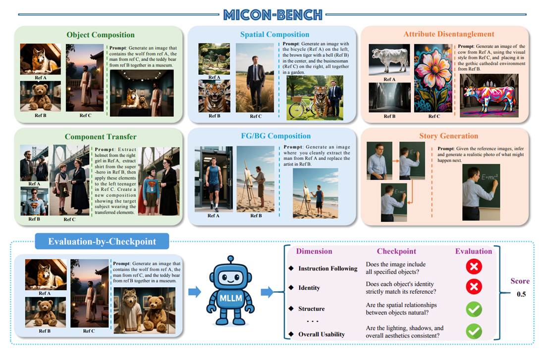在统一多模态模型(UMMs)飞速发展的今天,图像理解与生成能力已取得显著突破。然而,尽管如 Gemini 等模型已展现出对多张相关图像的推理能力,现有的基准测试仍主要局限于文本生成图像(T2I)或单图编辑任务,难以有效评估“多图像上下文生成”这一新兴领域的挑战。本文提出了一种全新的基准测试——MICON-Bench,旨在全面评估和提升模型在多图像语境下的生成能力。MICON-Bench 包含六大核心任务,涵盖了从基础的物体组合、属性迁移,到高阶的视觉故事生成等复杂场景,重点考察模型在跨图像组合、上下文推理及身份保持方面的表现。为了解决评估难题,本文设计了一套由多模态大语言模型(MLLM)驱动的“检查点评估”框架,能够自动且客观地验证生成内容在语义和视觉上的一致性。此外,针对现有模型在处理多图像输入时容易出现的注意力分散和幻觉问题,本文提出了一种名为动态注意力重平衡的创新机制。DAR 是一种无需训练、即插即用的方法,它能在推理过程中动态识别并增强与任务相关的图像区域关注度,同时抑制无关干扰。实验结果表明,MICON-Bench 有效揭示了当前最先进模型在多图像推理中的短板,而 DAR 显著提升了生成的连贯性与质量。这项工作不仅为多图像上下文生成提供了标准化的评估平台,也为未来更灵活、更精准的多模态生成模型指明了方向。