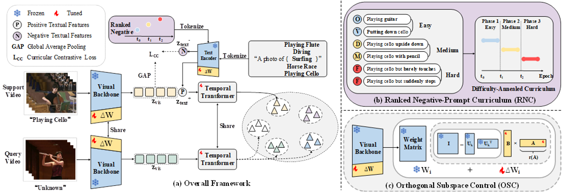 将视觉语言模型适配到小样本动作识别任务时,往往需要在准确率与稳定性之间做权衡:面向特定任务的性能提升可能会触发对领域通用知识的灾难性遗忘,并降低类别间的区分度。在小样本任务的 episode 中,每个查询样本通常只与一个正类以及少量负类进行对比,使得文本编码器接触到的提示多样性有限,也较少在决策边界附近看到困难反例。因此,本文提出一种P2A (Protect-to-Adapt) 微调方法,通过估计预训练骨干网络的主语义子空间,并将低秩更新约束在其正交补空间内,从而在允许任务特定适配的同时保留领域通用语义。同时,利用大语言模型生成经过验证器筛选、难度逐步递增的负提示。这些类别相关的困难反例能够在小样本条件下扩大类间间隔、锐化决策边界。在仅训练骨干网络 2% 参数的情况下,P2A 在五个 FSAR 基准上达到最先进性能,并在跨数据集的持续学习设置中显著缓解灾难性遗忘:模型无需回放,即可依次适配多个视频数据集。