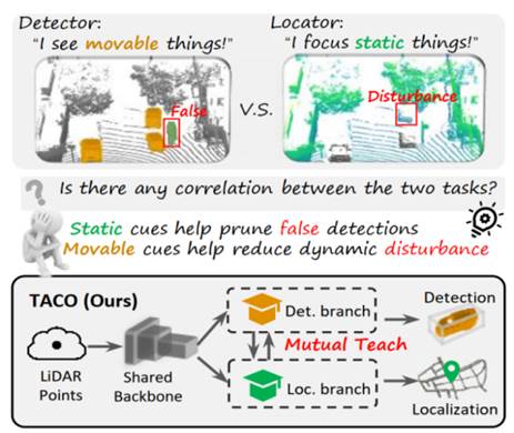 自车定位和目标感知是自动驾驶车和智能机器人的关键任务。激光雷达视觉定位是对GNSS定位系统的有效补充手段。现有系统通常将定位与检测模型分离设计、分别优化,这导致计算冗余,也限制了跨任务知识迁移的潜力。此外,两项任务在语义关注与几何先验上存在差异,导致特征表示层面产生冲突,简单共享特征的多任务训练会导致性能下降。针对以上问题,本文提出了一种视觉定位和目标检测多任务学习框架TACO,通过对静态场景的几何结构特征与可移动目标的语义判别特征进行解耦,从而建立两个任务在同一框架下的协同关系。论文进一步构建了OxfoLD数据集以支撑训练与评估,实验结果表明,TACO在定位和检测性能上均有显著提升。